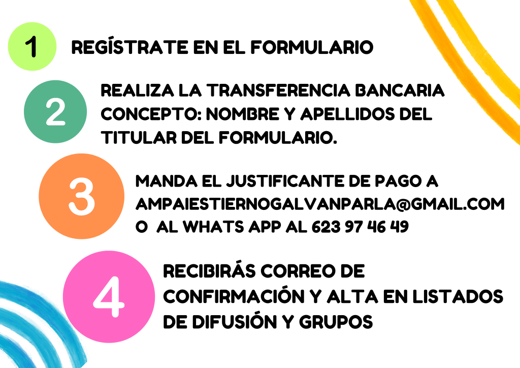• 3. MANDAR EL JUSTIFICANTE DE PAGO POR MAIL ampaiestiernogalvanparla@gmail.com o POR WHATS APP AL tlf del AMPA: 623 97 46 49